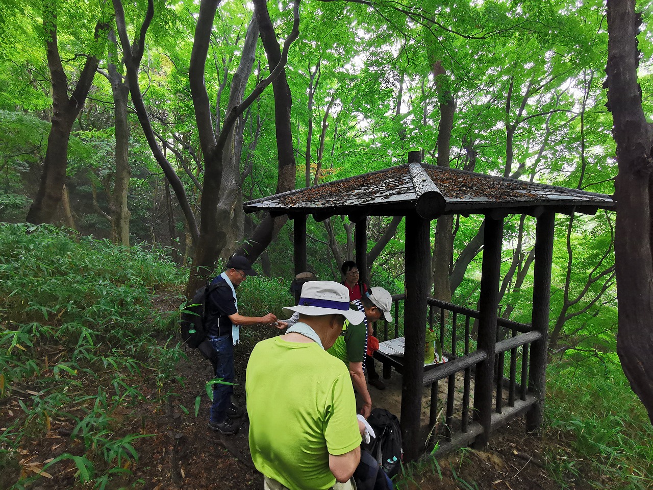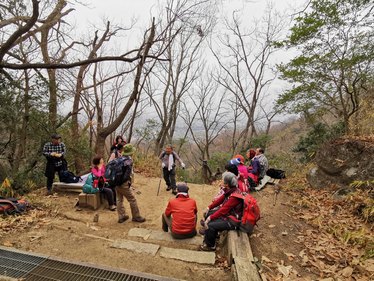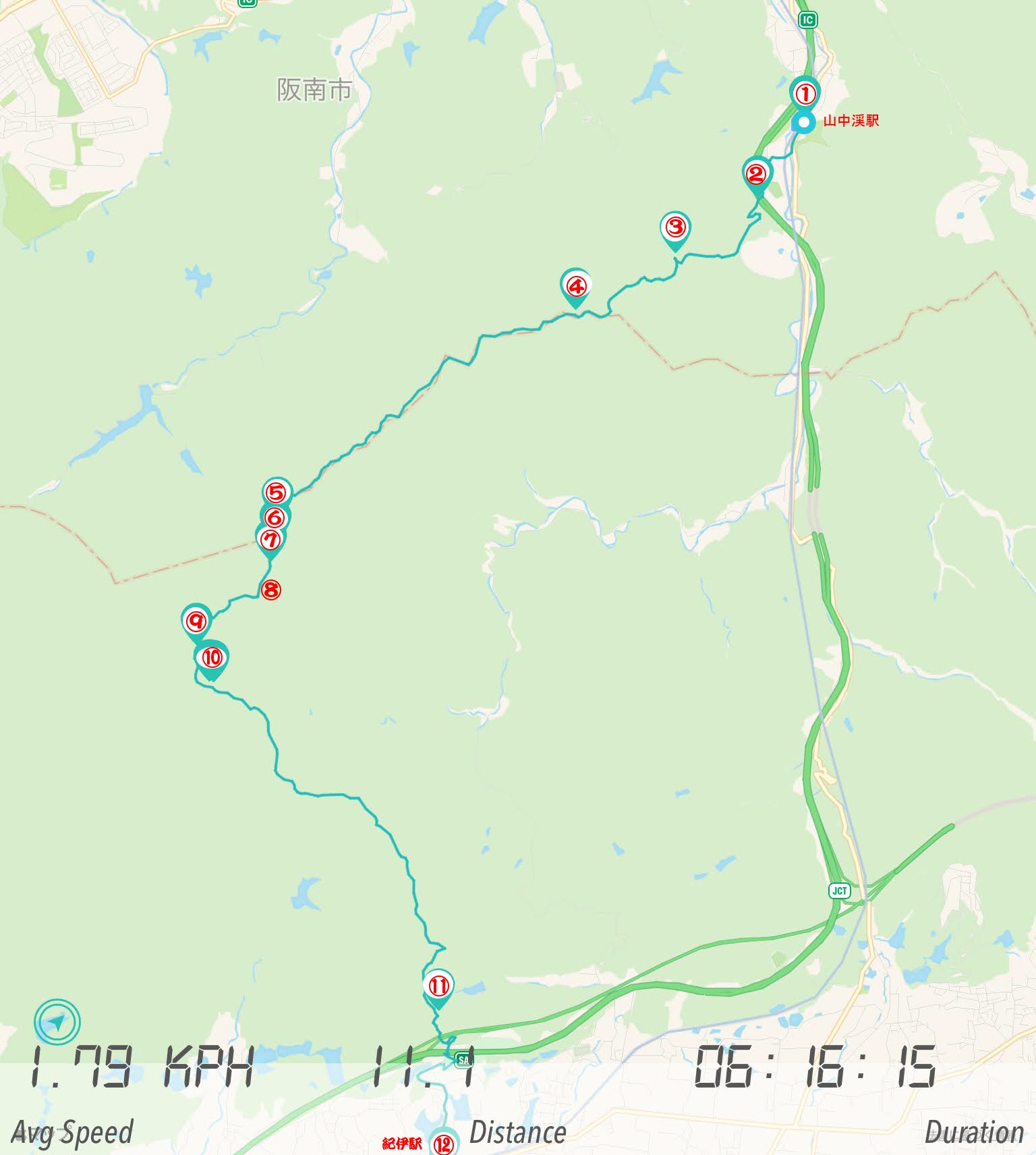 8時半、鳳駅ホームで集合 9時半山中渓を出発 約1時間で第一パノラマ到着 13時過ぎ、遅めの昼食は展望広場で その後帰路を急ぐ、 2時間ほどでJR紀伊駅に到着 総歩行距離11.1km 所要時間6時間16分 平均速度 1.79km (休憩時間含む) |